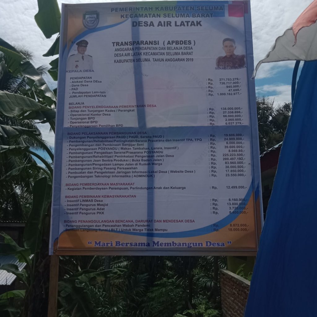 Mengingat sekarang adalah jaman keterbukaan,transparansi dan akuntabel maka kami pemerintah Desa Air Latak kecamatan Seluma Barat Kabupaten Seluma menjunjung azas keterbukaan, Transparansi dan Akuntabel tersebut.